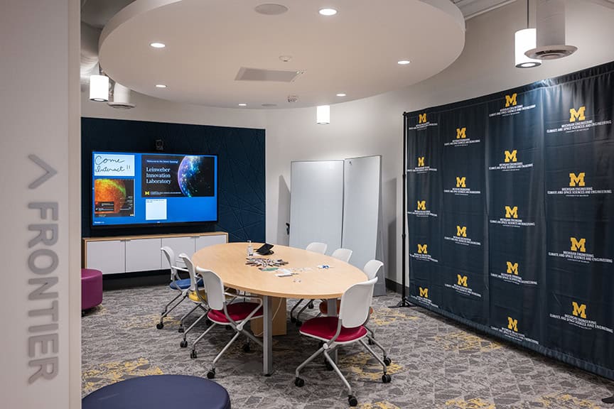 The Leinweber Innovation Laboratory had a uniquely clear vision from the start, according to Peg Peterson, Director of Facilities at University of Michigan College of Engineering, and Design Manager Jana Hayford. The clarity of that vision is evident in the details of the space, which features imagery from space missions and rooms named after several NASA Missions that involved U-M contributions.